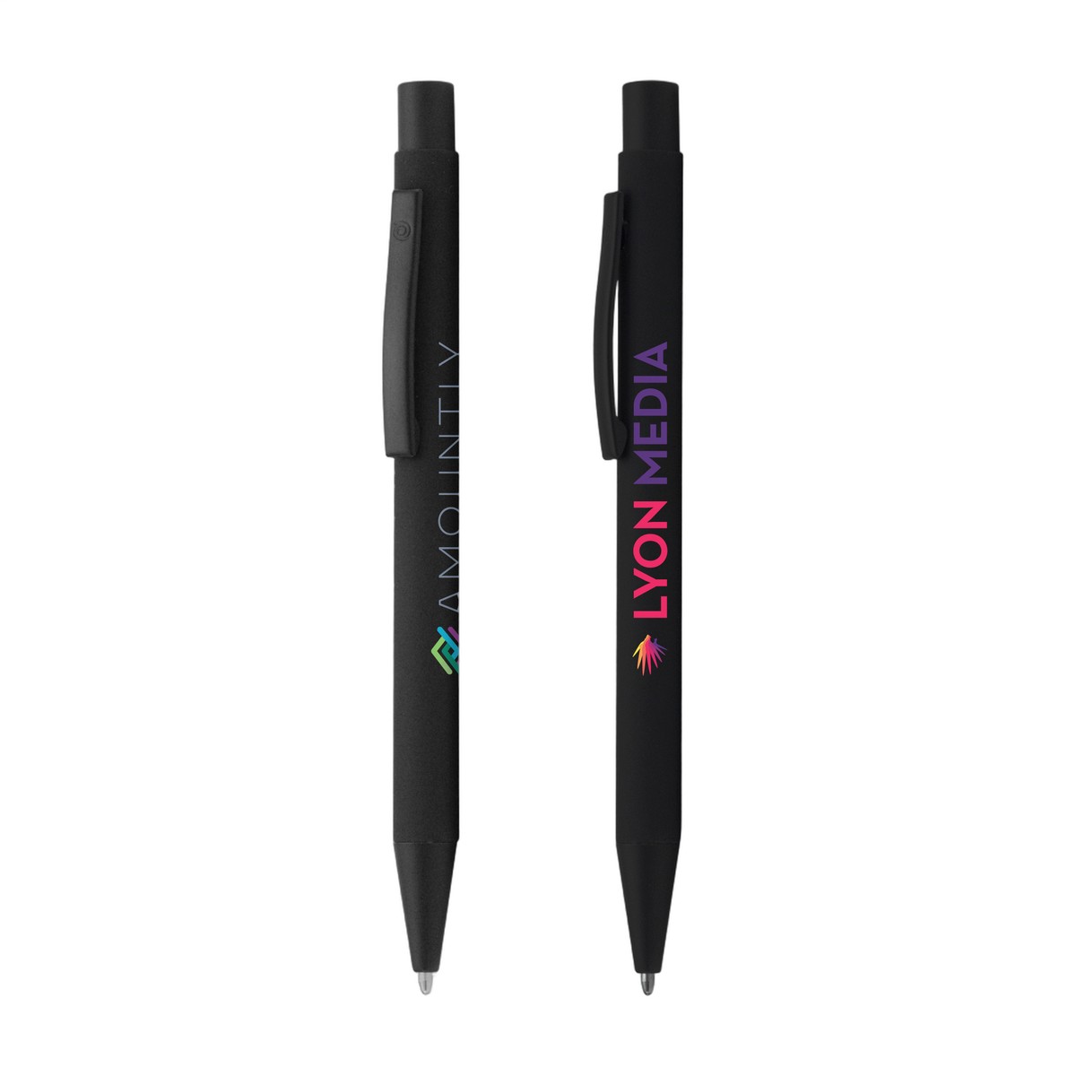 The Bowie Black Softy metal ballpoint pen features a trendy rubberized finish and a smooth writing high capacity cartridge. A black trim, clip, and accents provide a dramatic effect that makes artwork pop! Customize with a full color direct imprint. An excellent value to make a great impression.