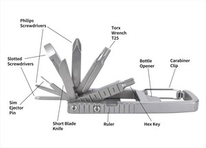 This tool kit is as elegant as it is functional. You can easily transport it anywhere you go thanks to the built-in carabiner. Featuring everything from screwdrivers to a bottle opener to a ruler, this tool kit will help you get the job done no matter where you are. Comes with a carrying pouch. 1.4375" W x 3.4375" H x 0.375" D
