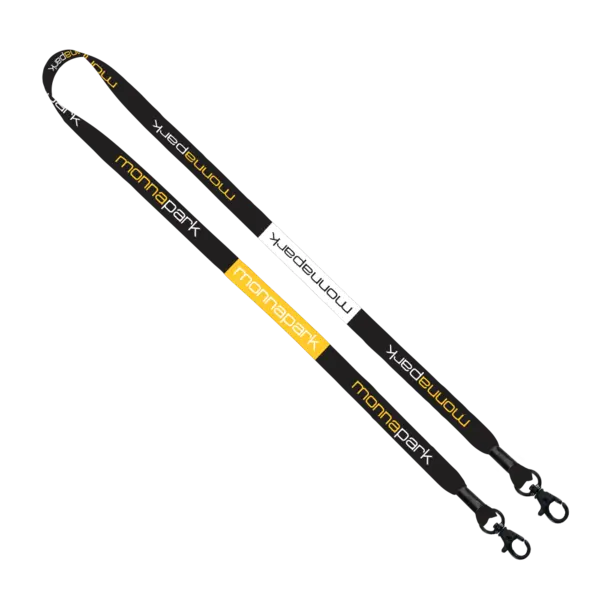Dye Sublimated Double Swivel Lobster Claw Lanyard. 16" per side. Complies with Prop 65. 0.5" W x 16" L