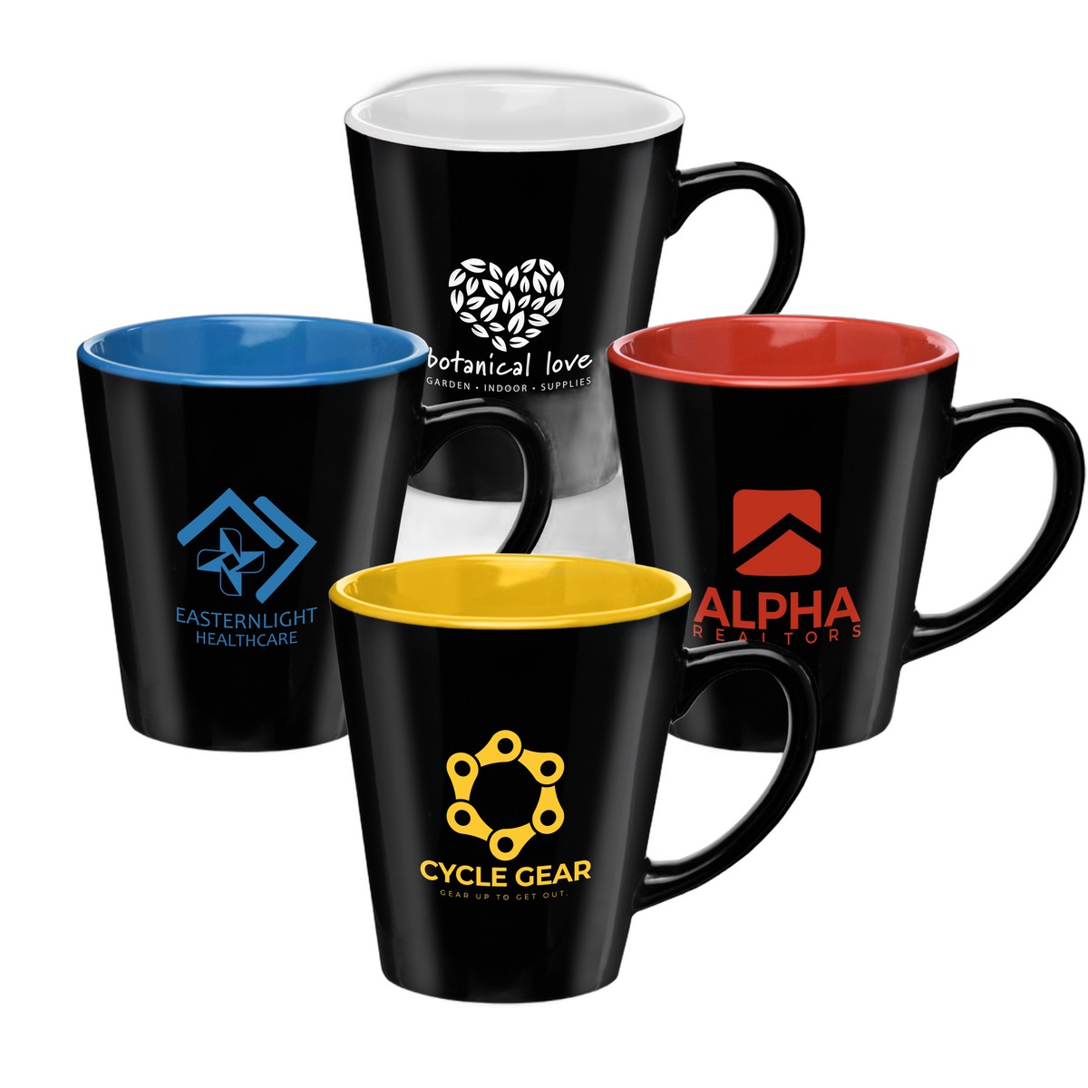 Make a bold impression with this 12 oz. ceramic mug that features a black exterior and handle, and a contrasting color interior that matches the 1-color silkscreen imprint. CA Prop 65 compliant. Hand wash only. Complies with Prop 65. 4.01" H x 3.54" W