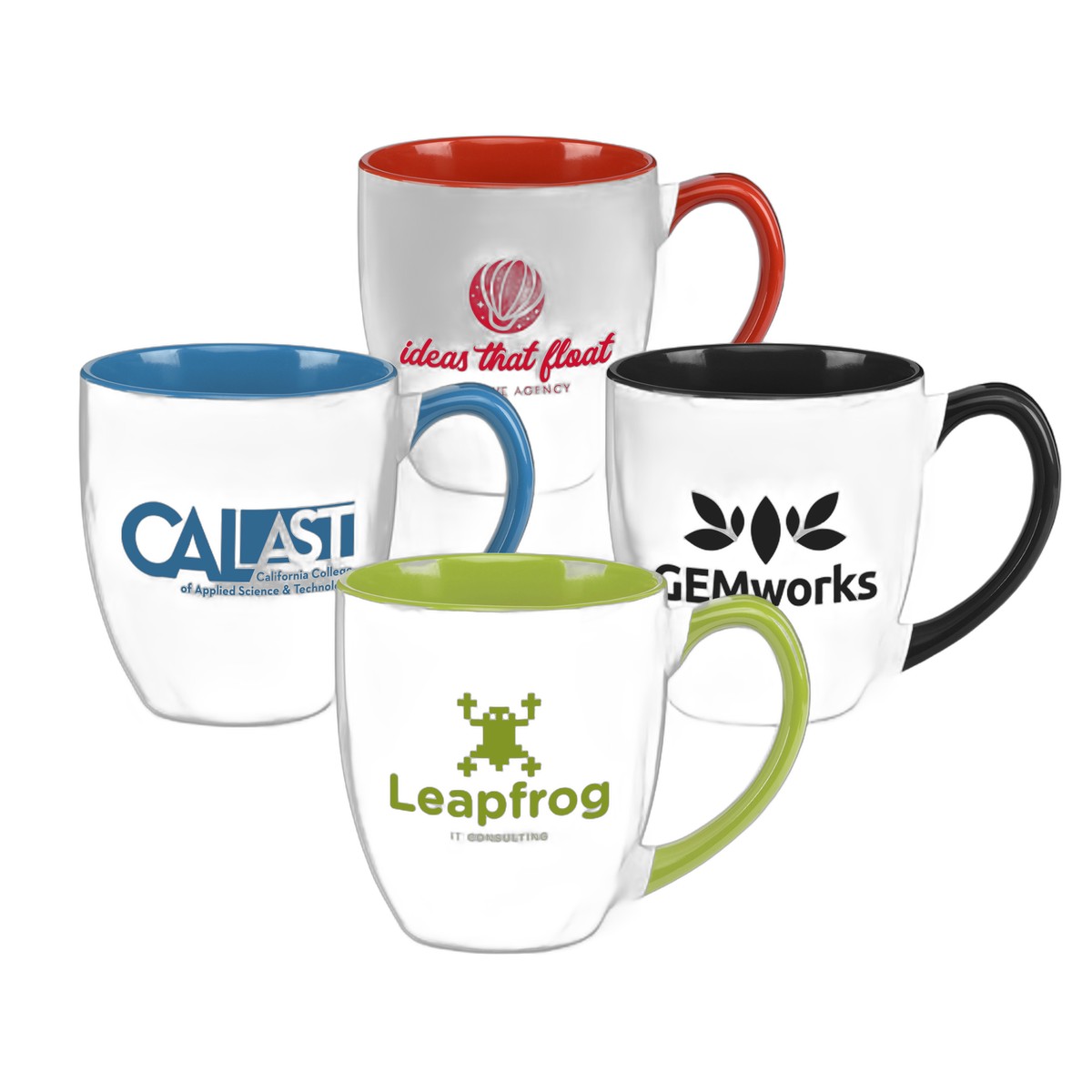 Make a big impact with this large 15 oz. ceramic mug that features a white exterior with contrasting color interior & handle. Customize the mug with your logo, . CA Prop 65 compliant. Hand wash only. Complies with Prop 65. 4.07" H x 3.69" W