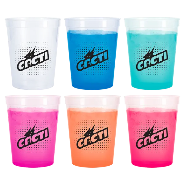 Our 16 oz Color Changing Stadium Cup is the cup that knows how to party. Frosty at first glance, it bursts into vibrant color the moment you pour in a cold drink, making every sip a little more fun. Perfect for tailgates, backyard bashes, or just showing off at the office water cooler, this reusable, BPA-free cup is built to keep the good times rolling. Proudly made in the USA, it's the eco-friendly way to raise your glass and let the color do the talking.FEATURES- 16 oz capacity Stadium Cup- Changes from Frost to color as cold beverage is added- Great for Tailgating and Parties- Reusable- BPA free- Made in USA