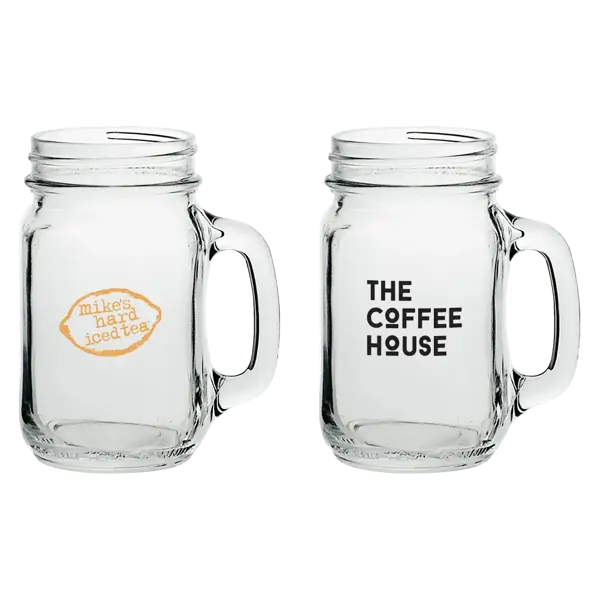 Rustic charm meets versatility with these 16 Oz. Mason Jars with Handles. Crafted from durable glass, these jars add a nostalgic touch to your drinks. With a generous capacity, perfect for iced teas or cocktails-- they're ideal for any occasion. Elevate your sipping experience with these trendy Mason Jar Drinking Glasses classic meets contemporary in every refreshing sip! 4.1" W x 5.3" H