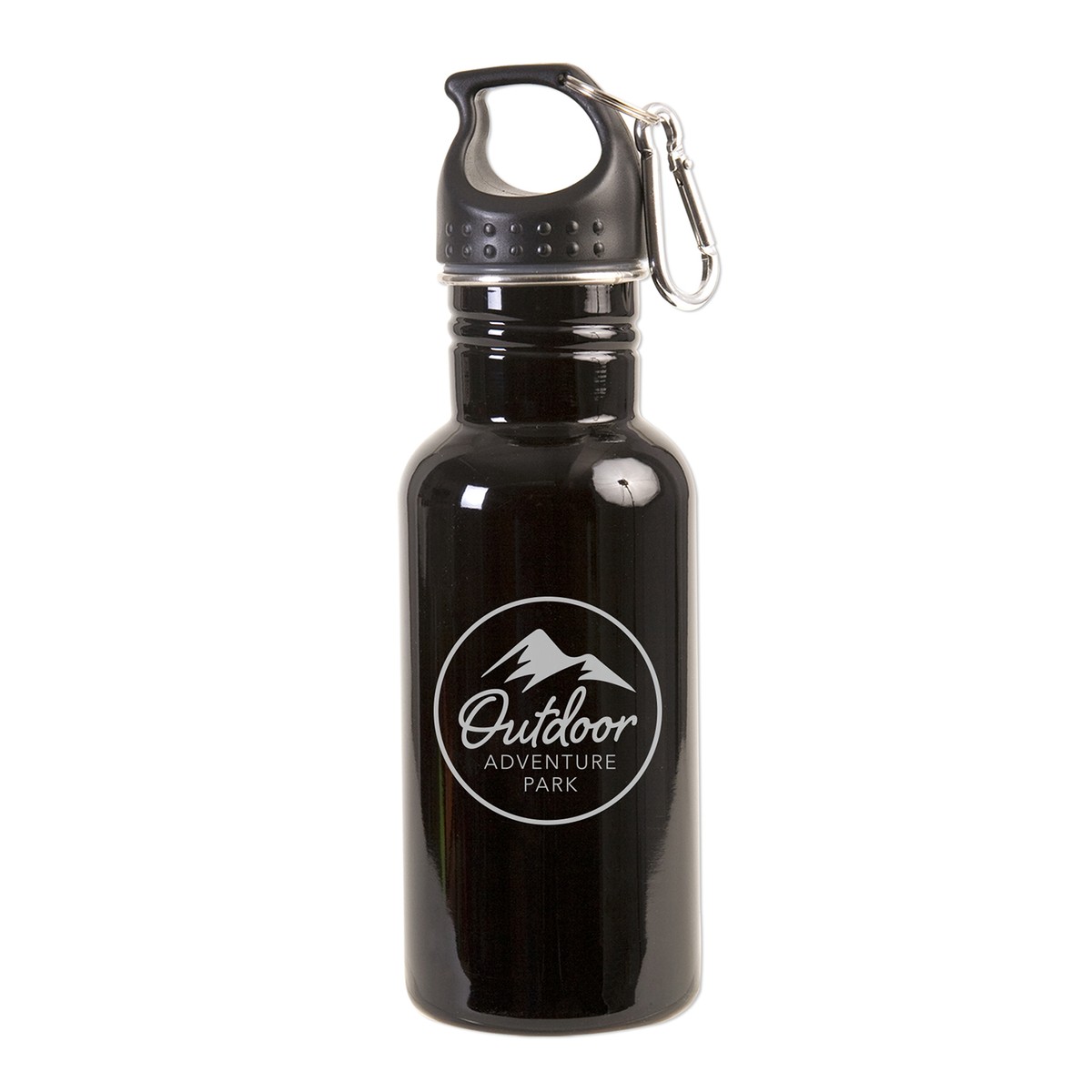 Stainless Steel BPA-free 17 oz. (500 mL) water bottle. Features a wide mouth opening and a leak-proof screw-down lid with mini metal carabiner attached (carabiner measures approx. 2"l x 1"h x 0.125"d). Comes in a variety of metallic and opaque colors. Do not microwave. Not dishwasher safe. Hand-wash only. **CO2 Laser engraving is not available on Silver color**. 9.0000" H x 2.7500" Diameter