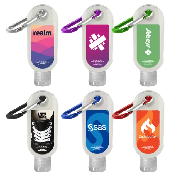 There is nothing cute about lobster-red sunburn. Unless you're going for the scorched, "my skin hasn't seen daylight in months" vacationer look. (You do you). We think you should do your customers a solid while you promote your brand by handing out our best-selling SPF 30 sunscreen. Choose a carabiner color that jives with your business's vibe, and add your custom logo. Feel good about your design and swag purchase, too. Every batch is made in the USA right here in our FDA registered facility. Complies with CPSIA, FDA, Prop 65. 1.625" W x 4.5" H