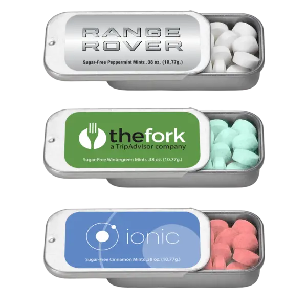 Want to keep your brand fresh in people's minds and mouths? Give away this trendy silver mint tin at upcoming business events. The way coffee flows at conferences (coffee breath...ew) people will definitely thank you. They'll be all eyes as you suavely slide the branded lid from your mints with one hand...and offer your other hand for a firm shake. Delving out pocked-sized tins filled with sugar-free, gluten-free fresh breath magic. Impressive? Prepared? Hell yes you are, you networking machine. Complies with CPSIA, FDA, Food Grade, Prop 65. 2" W x 1" H x 0.375" D