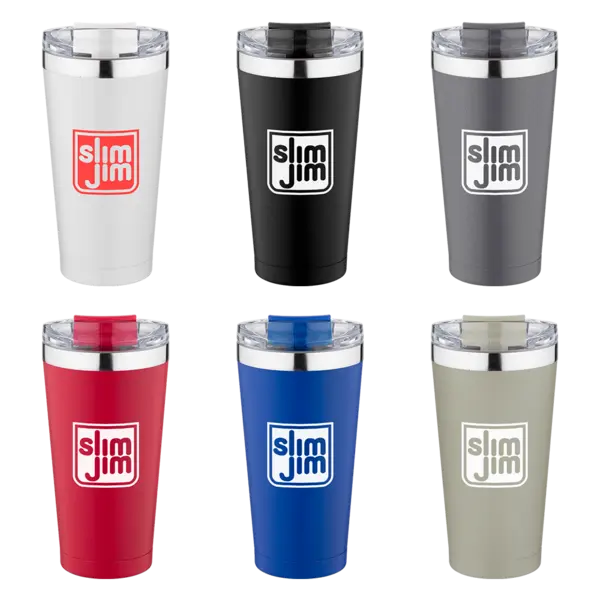 20 Oz. Heavy duty double wall stainless steel vacuum insulated tumbler. Features a clear AS screw-on lid with color matched PP flip top spout cover. Powder coat finish with copper lining and brushed silver accents; double wall 201/304 stainless steel. Fits in standard cup holders. Not microwave safe; hand wash only. 7.75" H x 3.875" W