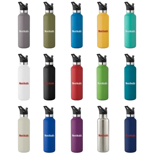 20 Oz. Narrow-mouth vacuum-insulated bottle. Features a flip-top straw lid with ergonomic top finger loop. Straw lid is not leakproof and not intended for use with hot liquids. Keeps contents cold for 24 hours. Powder coat finish with copper lining, double wall 18/8 stainless steel, proprietary BPA-free insulated lid. Bottle comes with both screw-on lid and straw lid. Please note: straw lid does not come inserted into bottle. 11" H x 2.875" D