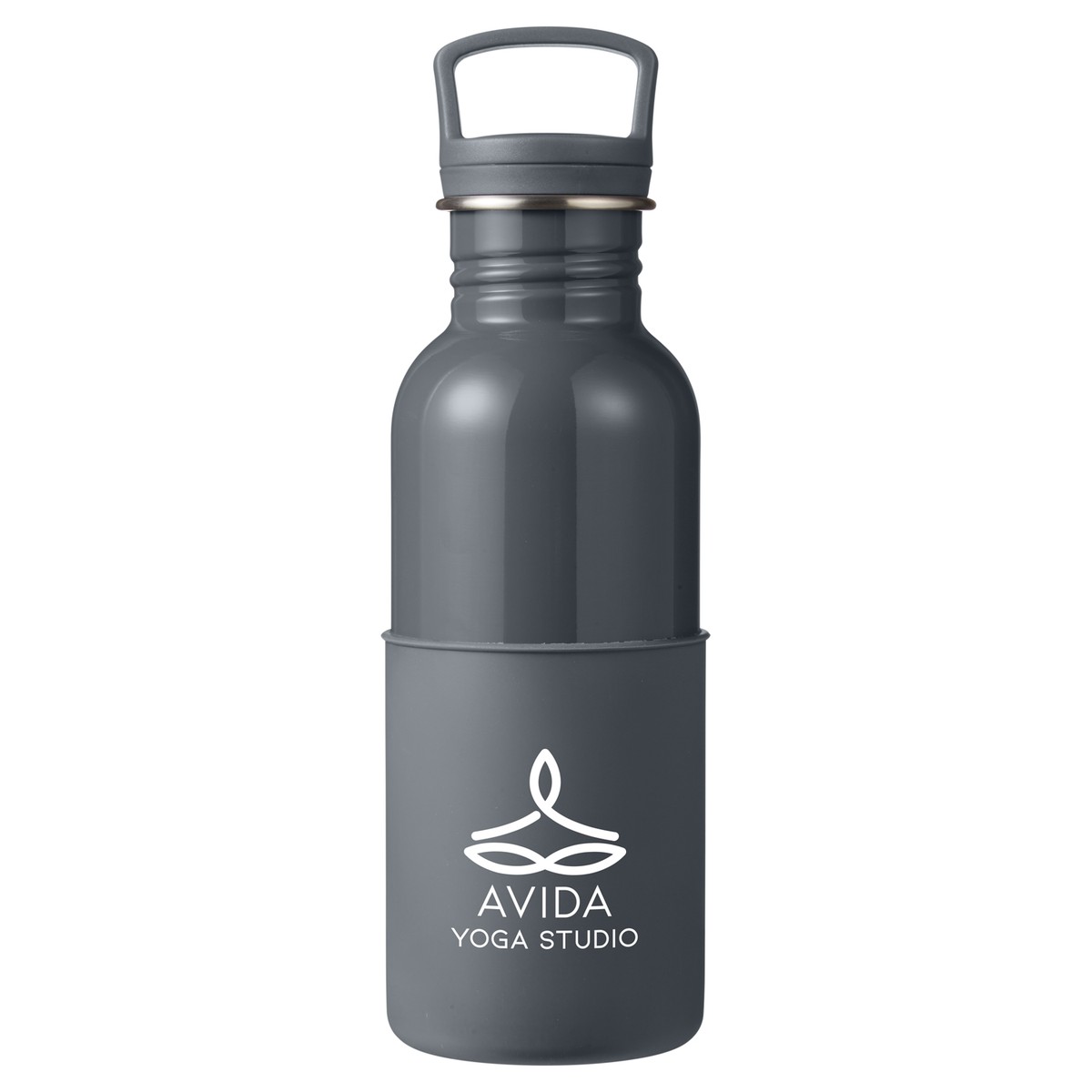 20 oz. Stainless steel water bottle. Silicone sleeve helps keep your bottle in impeccable shape. Shiny finish with matte sleeve. Single-wall, lightweight design for cool beverages. PP Plastic screw-on loop-lid for easy carry. Hand wash. 9.4500" H x 2.9500" Diameter