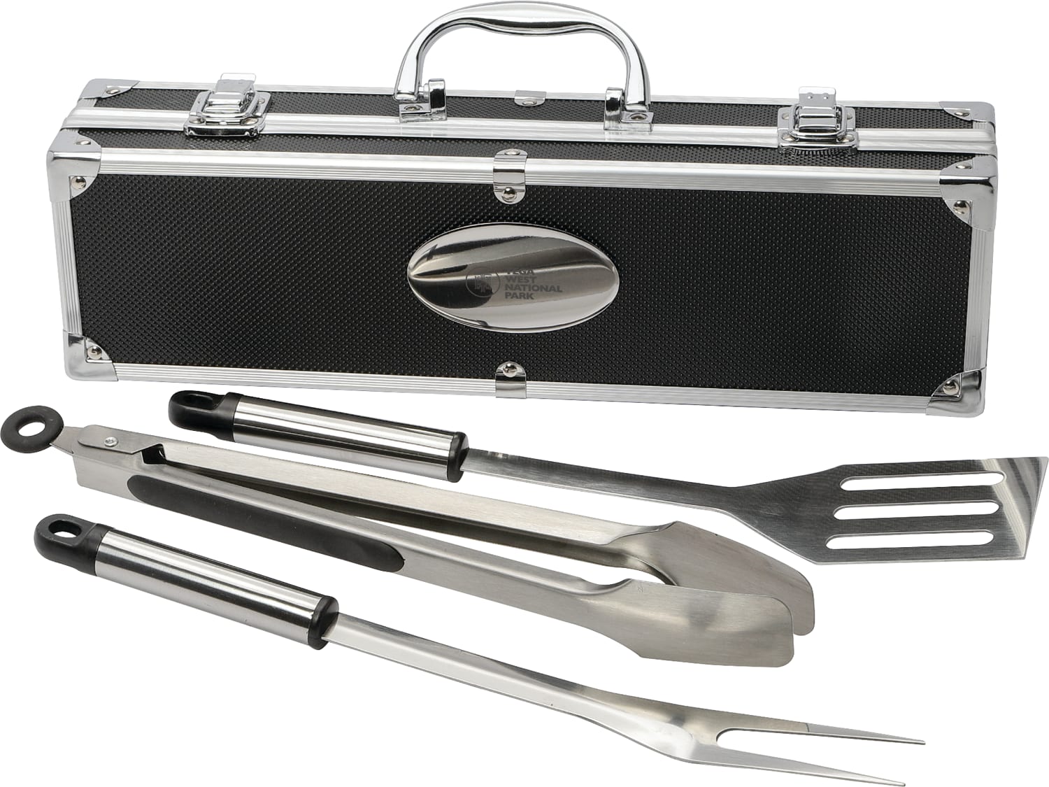 The Bullet 3 Piece BBQ set in Aluminum Case has everything you need to get grilling! This 3-piece kit includes a stainless steel spatula, fork, and tongs all packaged in an aluminum-trimmed carrying case. 4.00" D x 14.00" W x 3.00" H