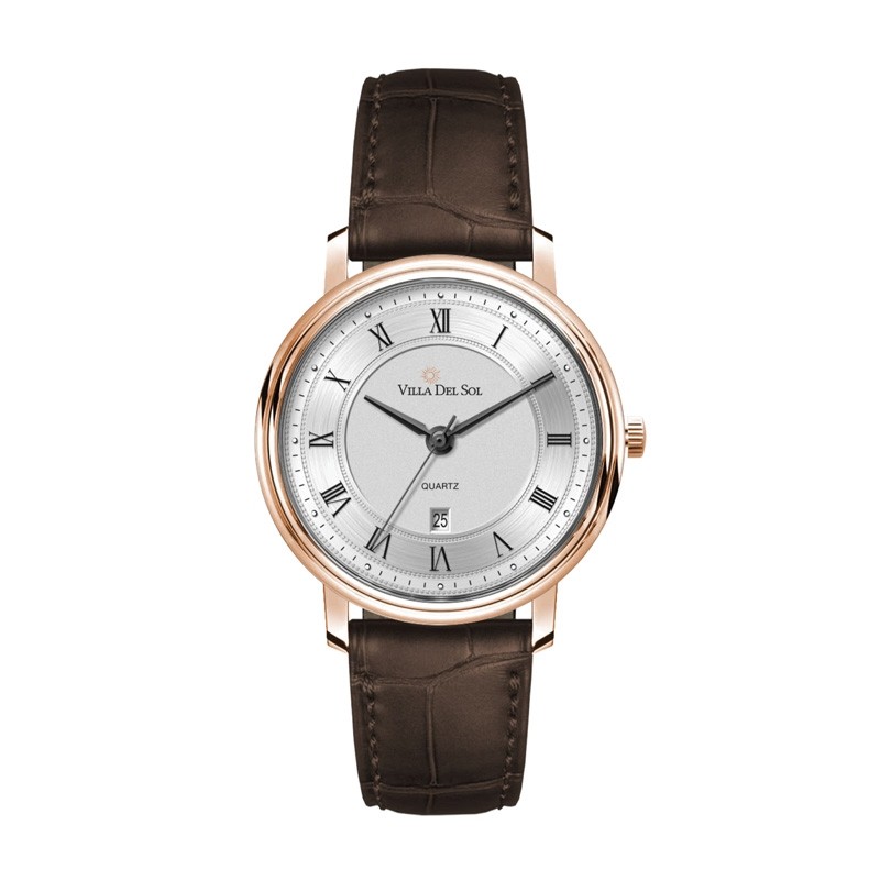 32mm stainless steel polished rose gold case, japan 3-hand mvt, date display, flat mineral crystal, brown croc pattern leather strap, water resistant to 5 atm. Complies with Prop 65. 1" W x 1" H x 1" D