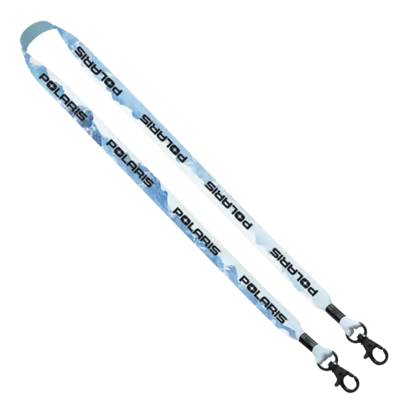 3/4", Dye Sublimated, Double Swivel, Lobster Claw, Hook, Lanyard. Complies with Prop 65. 0.75" W x 16" L