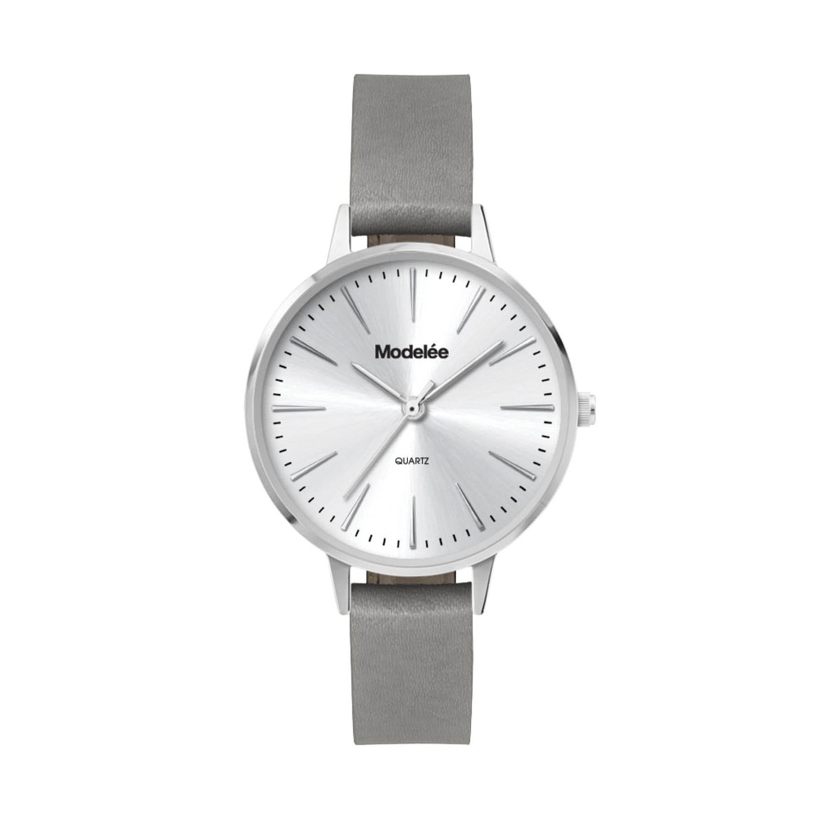 34mm polished silver metal case, japan 3-hand mvt, flat mineral crystal, grey natural leather strap, water resistant to 3 atm. Complies with Prop 65. 1" W x 1" H x 1" D