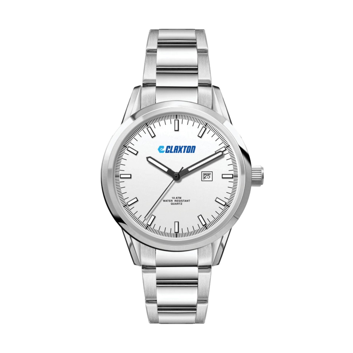 34mm stainless steel polished silver case, japan 3-hand mvt, date display, flat mineral crystal, folded steel bracelet, water resistant to 10 atm. Complies with Prop 65. 1" W x 1" H x 1" D