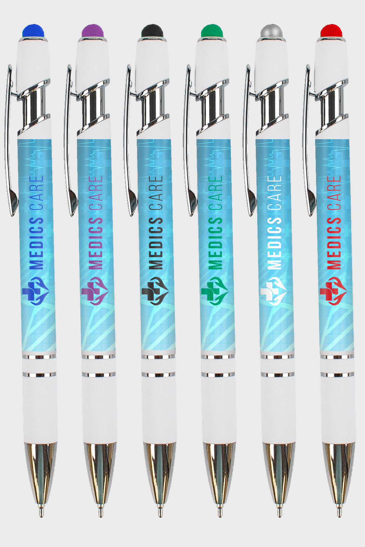 Unleash creativity and style with the 360 Comfort Stylus! This sleek pen features a white soft-touch barrel with vibrant chrome accents, ensuring a comfortable writing experience. The stylus offers smooth navigation for all touchscreen devices, while the smooth black hybrid ink provides a seamless writing flow. The standout 360-degree full-color infinity imprint area offers a premium branding opportunity, making this stylus a great choice for promotional giveaways that truly leave a lasting impression. Material: Plastic Standard Decoration Includes: Infinity Print On Barrel All Available Decoration Options: Infinity Print: 2.5" W x 1.24" H Barrel Straight Line Copy: No Tip Type: Ball Point Mechanism: Click Extend Standard Packaging: Bulk Tags: Pen, Stylus, Popular, Plastic, Tech, Accessory, Phone, Tablet, Tradeshow, Trade, Show, Desk, Office, Advertisement, College, Grade, Writing, Merchandise, Study, High School, University, Home