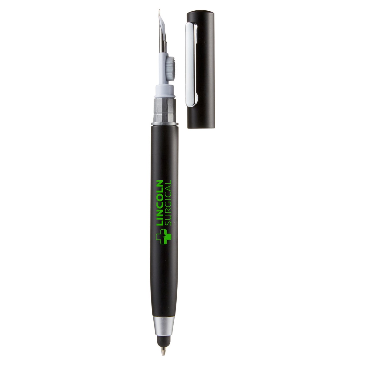 ABS Plastic. Protect your TWS earbud investment. Earbud metal cleaning tip hidden under cap to clear debris from the acoustic outlets and charging ports. Use side brush to dust away loose debris. Pull out cleaning tip to expose a long, flocked sponge for deeper cleaning. Twist pen with black ink and black silicone stylus. 5.7000" H