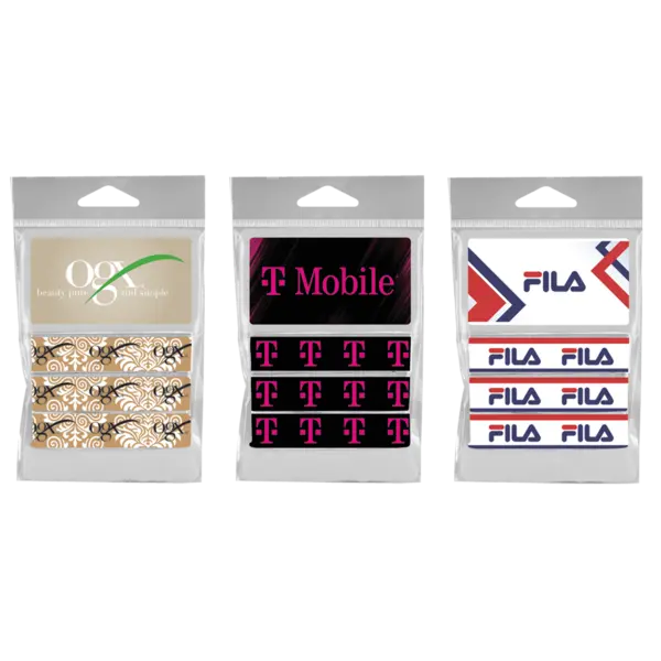 Give people a way to move their hair out of the way when they're hard at work with these fold-over hair ties! They come in a three-pack wrapped on a card and measure 3/4. These are made elastic, come in white, and are a great item to offer at pharmacies, gift shops, groceries stores, and hair salons. Add your company name or logo with our dye sublimation method and tie everything into your next marketing campaign!