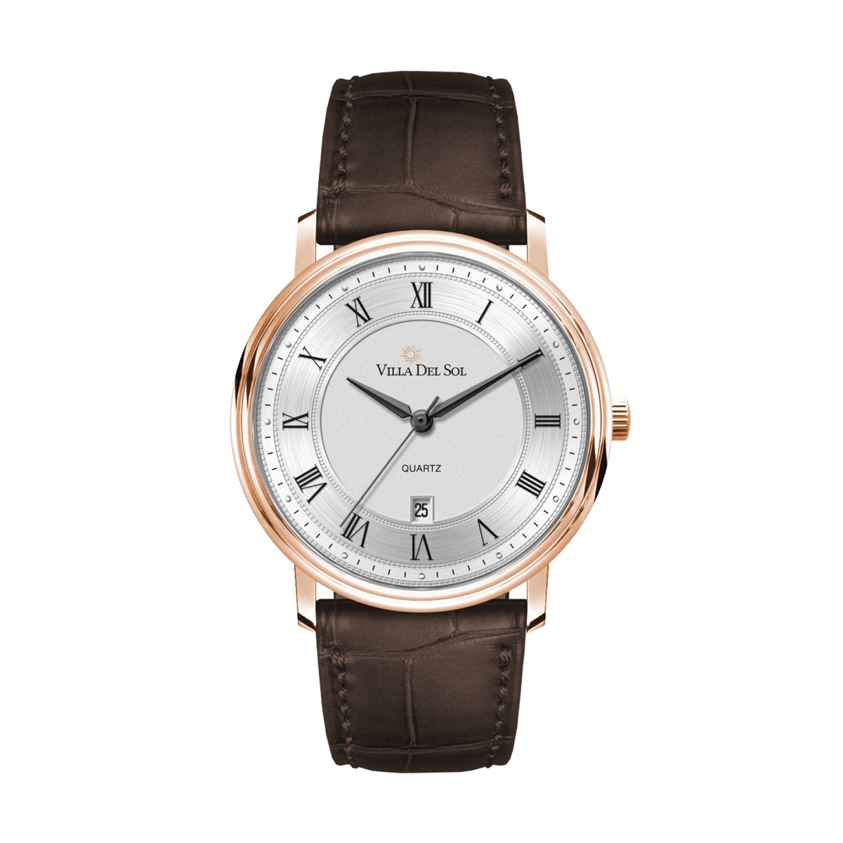 40mm stainless steel polished rose gold case, japan 3-hand mvt, date display, flat mineral crystal, brown croc pattern leather strap, water resistant to 5 atm. Complies with Prop 65. 1" W x 1" H x 1" D