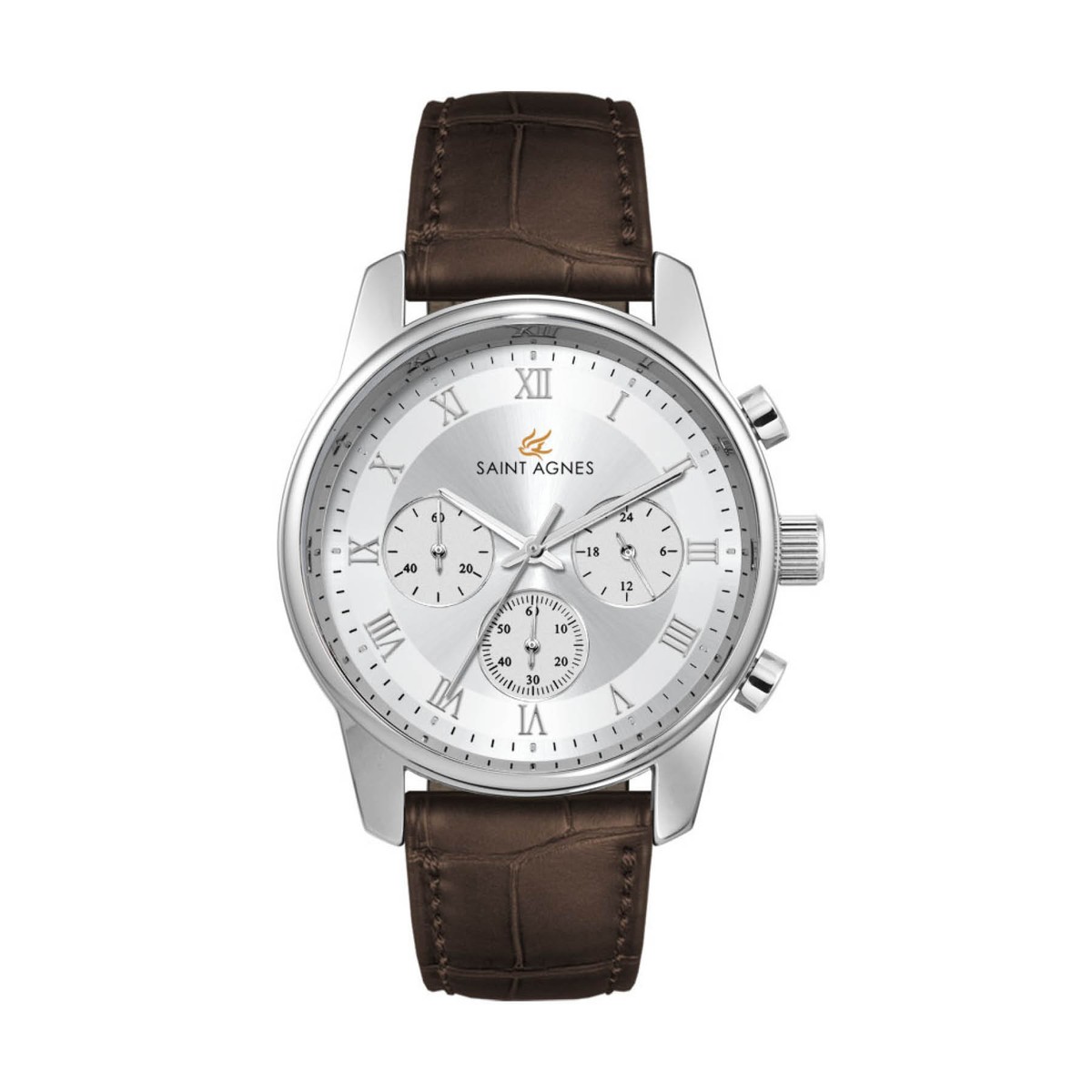 41mm polished silver metal case, japan chrono mvt, flat mineral crystal, brown croc pattern leather strap, water resistant to 3 atm. Complies with Prop 65. 1" W x 1" H x 1" D