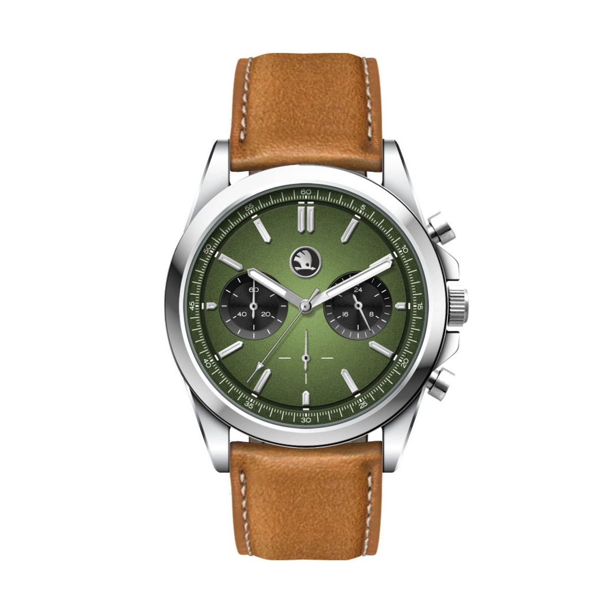 41mm polished silver metal case, japan chrono mvt, flat mineral crystal, black leather strap, water resistant to 3 atm. Complies with Prop 65. 1" W x 1" H x 1" D