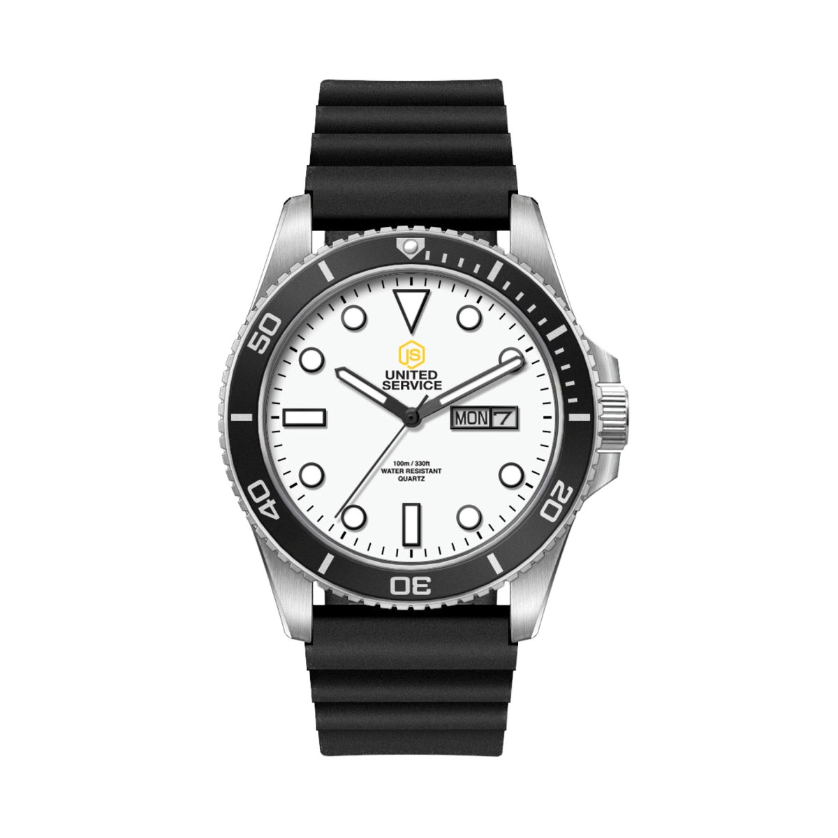 42.5mm stainless steel brushed silver case, black bezel, japan 3-hand mvt, day-date display, flat mineral crystal, black silicone strap, water resistant to 10 atm. Complies with Prop 65. 1" W x 1" H x 1" D