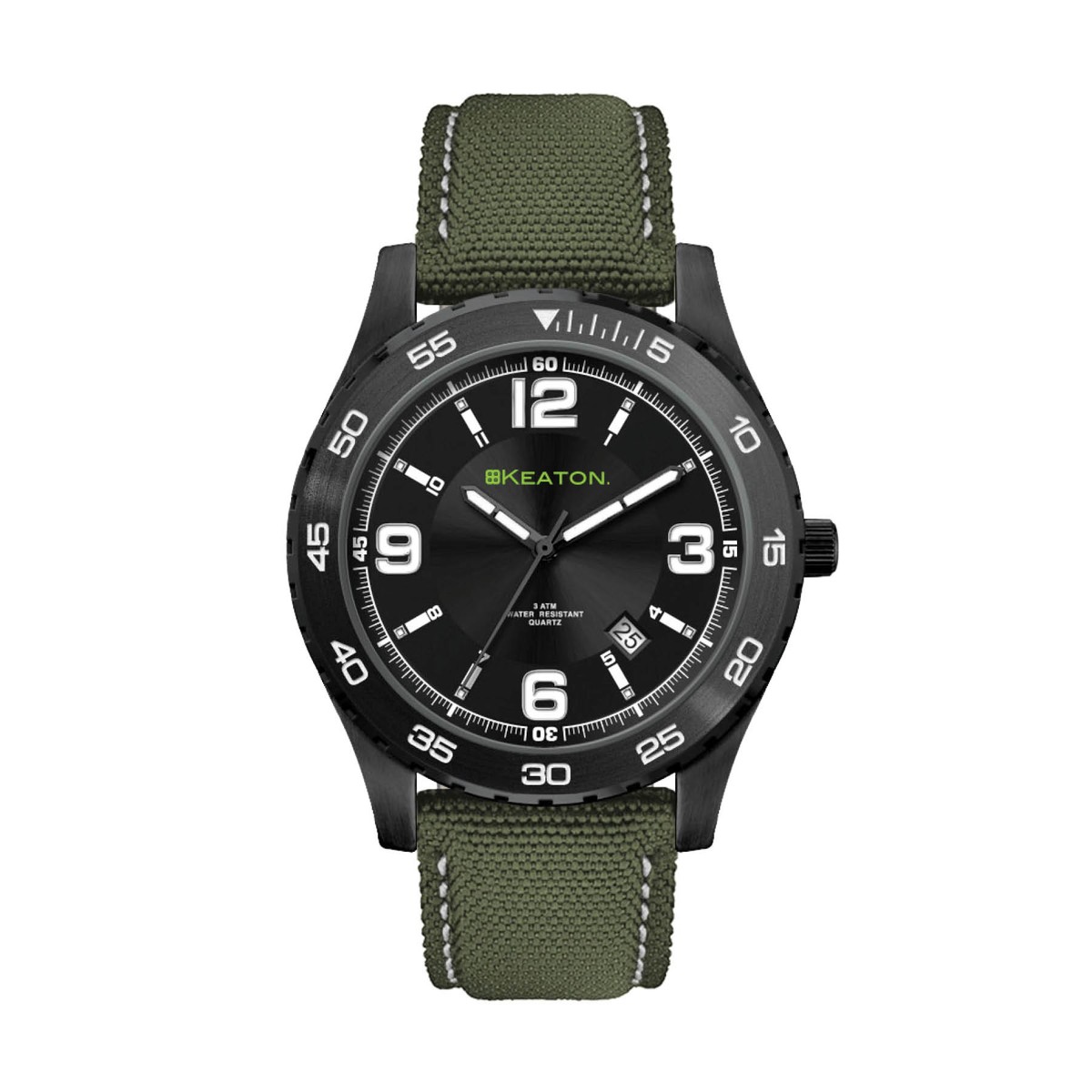 42mm matte black metal case, japan 3-hand mvt, date display, flat mineral crystal, green canvas strap, water resistant to 3 atm. Complies with Prop 65. 1" W x 1" H x 1" D