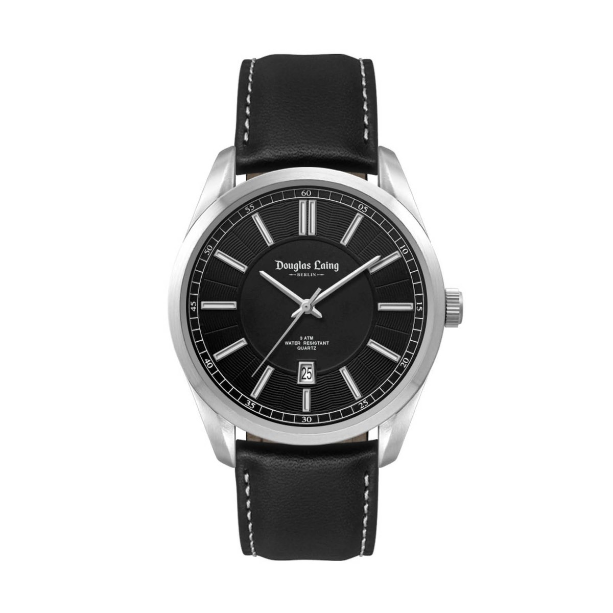 42mm brushed silver metal case, japan 3-hand mvt, date display, flat mineral crystal, black leather strap, water resistant to 3 atm. Complies with Prop 65. 1" W x 1" H x 1" D