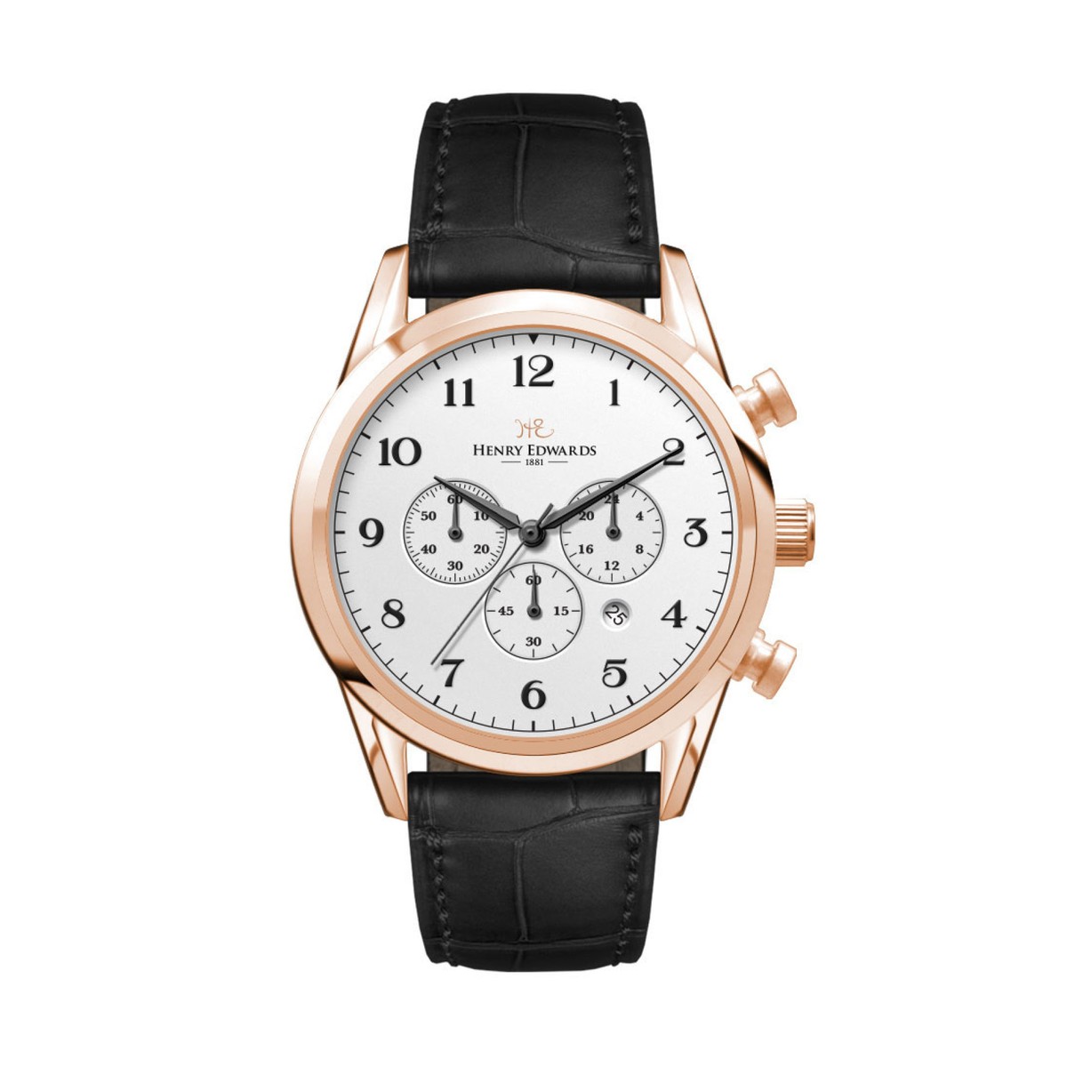 42mm stainless steel polished rose gold case, japan chrono mvt, date display, domed mineral crystal, black croc pattern leather strap, water resistant to 10 atm. Complies with Prop 65. 1" W x 1" H x 1" D