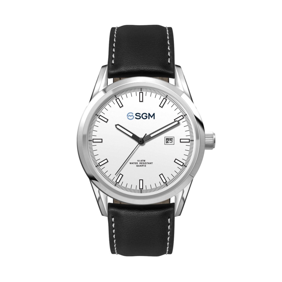 42mm stainless steel polished silver case, japan 3-hand mvt, date display, flat mineral crystal, black leather strap, water resistant to 10 atm. Complies with Prop 65. 1" W x 1" H x 1" D