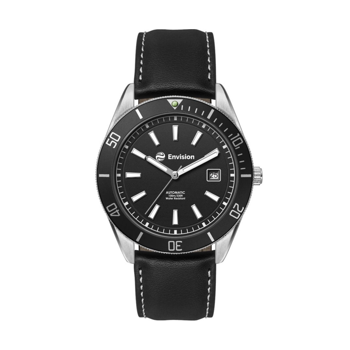 42mm stainless steel brushed silver case, black bezel, japan "automatic" mvt, date display, flat mineral crystal, black leather strap, water resistant to 10 atm. Complies with Prop 65. 1" W x 1" H x 1" D