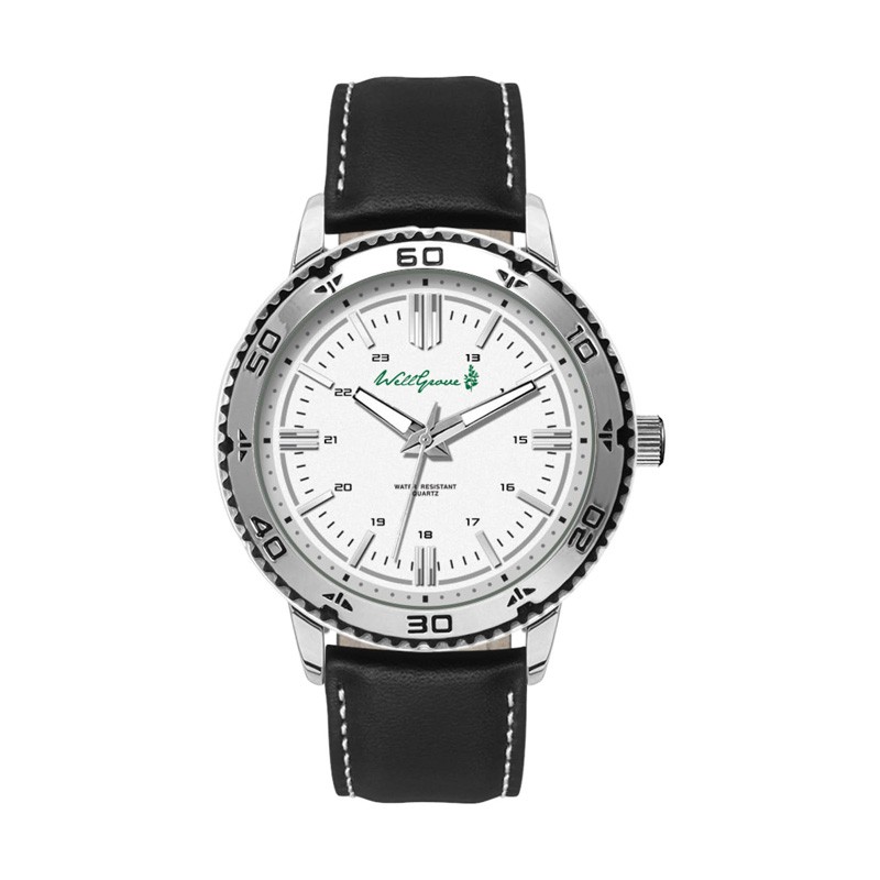 46mm brushed silver metal case, japan 3-hand mvt, flat mineral crystal, black leatherette strap, water resistant to 3 atm. Complies with Prop 65. 1" W x 1" H x 1" D