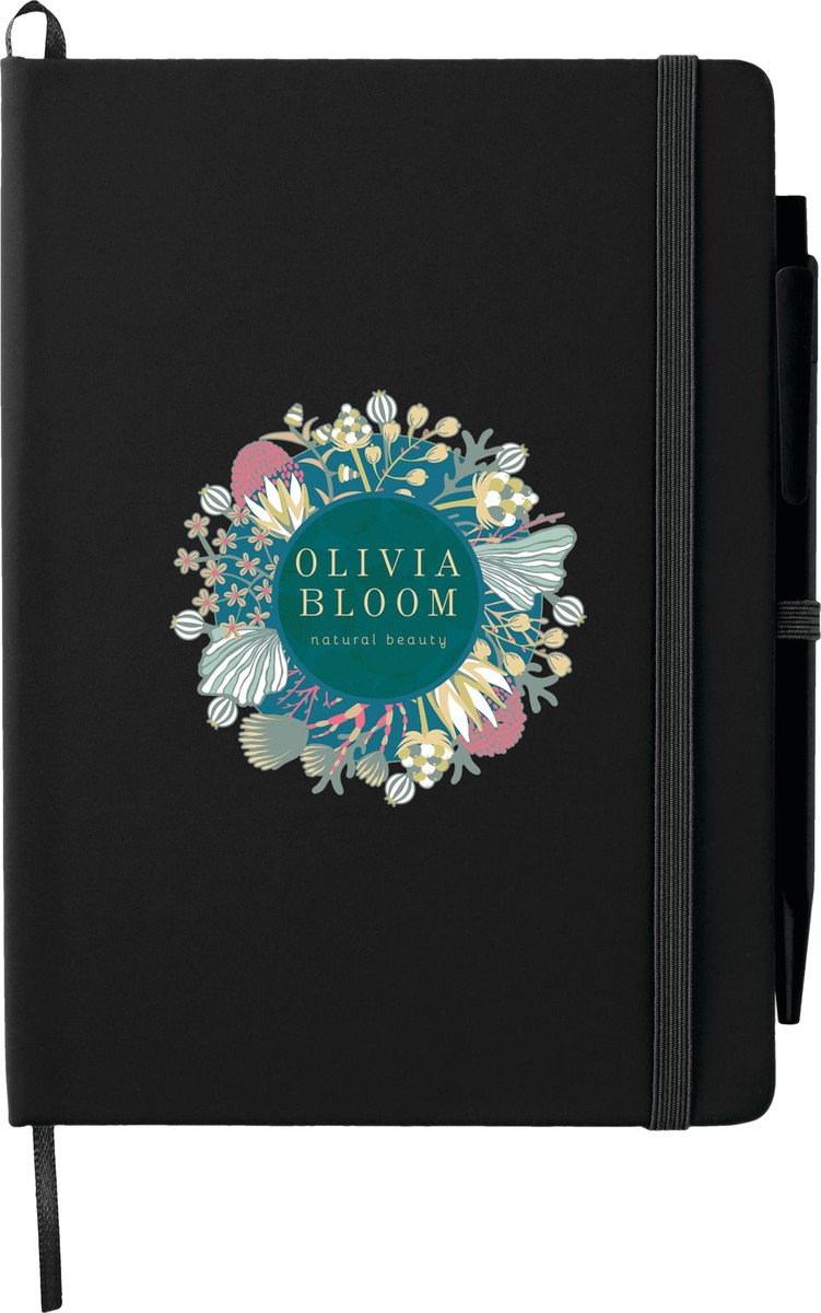 The Bullet 5'' x 7'' FSC® Mix Prime Notebook With Pen is a hardbound notebook with color matching elastic closure, ribbon page marker, and pen loop. It contains 50 sheets of white lined FSC® Mix pages and comes with a color matching pen with black ink cartridge. Note that pens are packed separately. 0.04" D x 5.00" W x 7.00" H