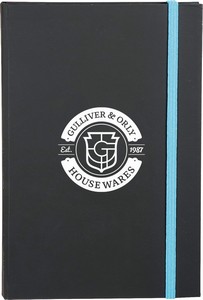 The 5.5'' x 8.5'' FSC® Mix Color Pop Bound Journal features a hard cover with a soft matte black cover to highlight the most subtle or colorful logos. This custom Journal includes 96 sheets of FSC® Mix cream lined paper with bright colored edges and corresponding color elastic closure. 0.50" D x 5.50" W x 8.25" H
