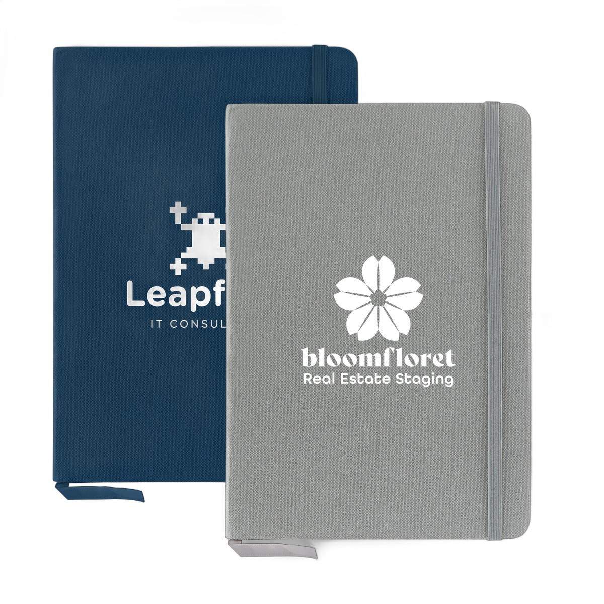 This 5.8'' x 8.3'' Recycled Cotton Notebook features a recycled cotton cover and includes 80 ivory lined sheets of 70g recycled paper. The notebook is designed with a matching elastic strap, pen loop, and ribbon bookmark, Promote your brand with a silkscreen 1-color imprint. Complies with Prop 65. 8.27" H x 5.83" W