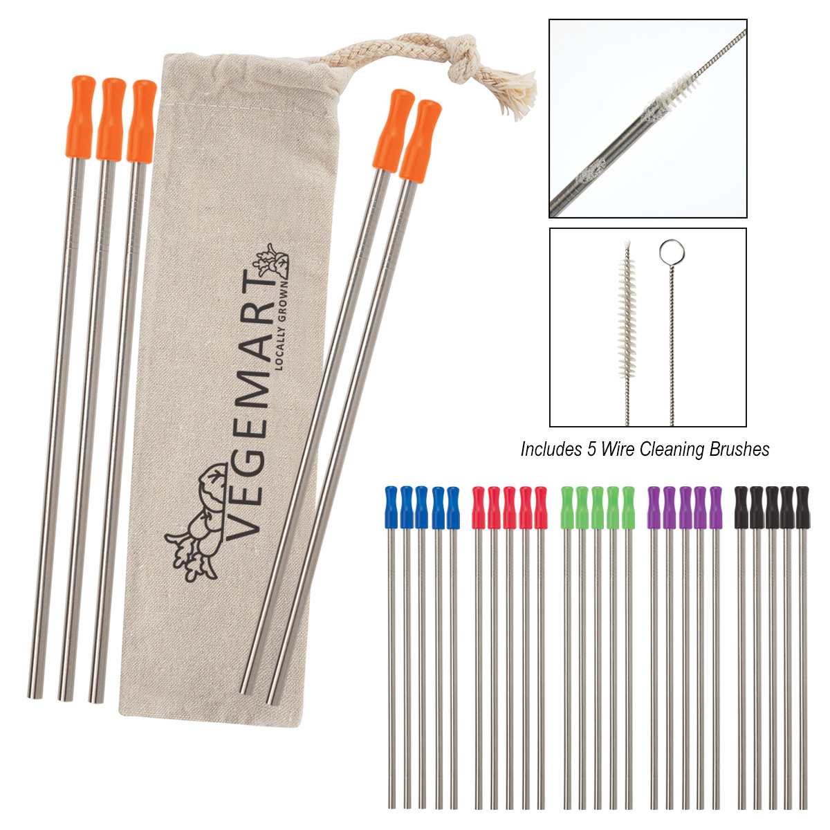Five Stainless Steel Straws, Three Silicone Tips and 8 Oz. Cotton Carrying Pouch. Reusable. Includes Five Wire Cleaning Brushes. Hand Wash Recommended. Complies with Prop 65. 10" W x 2 3/4" H