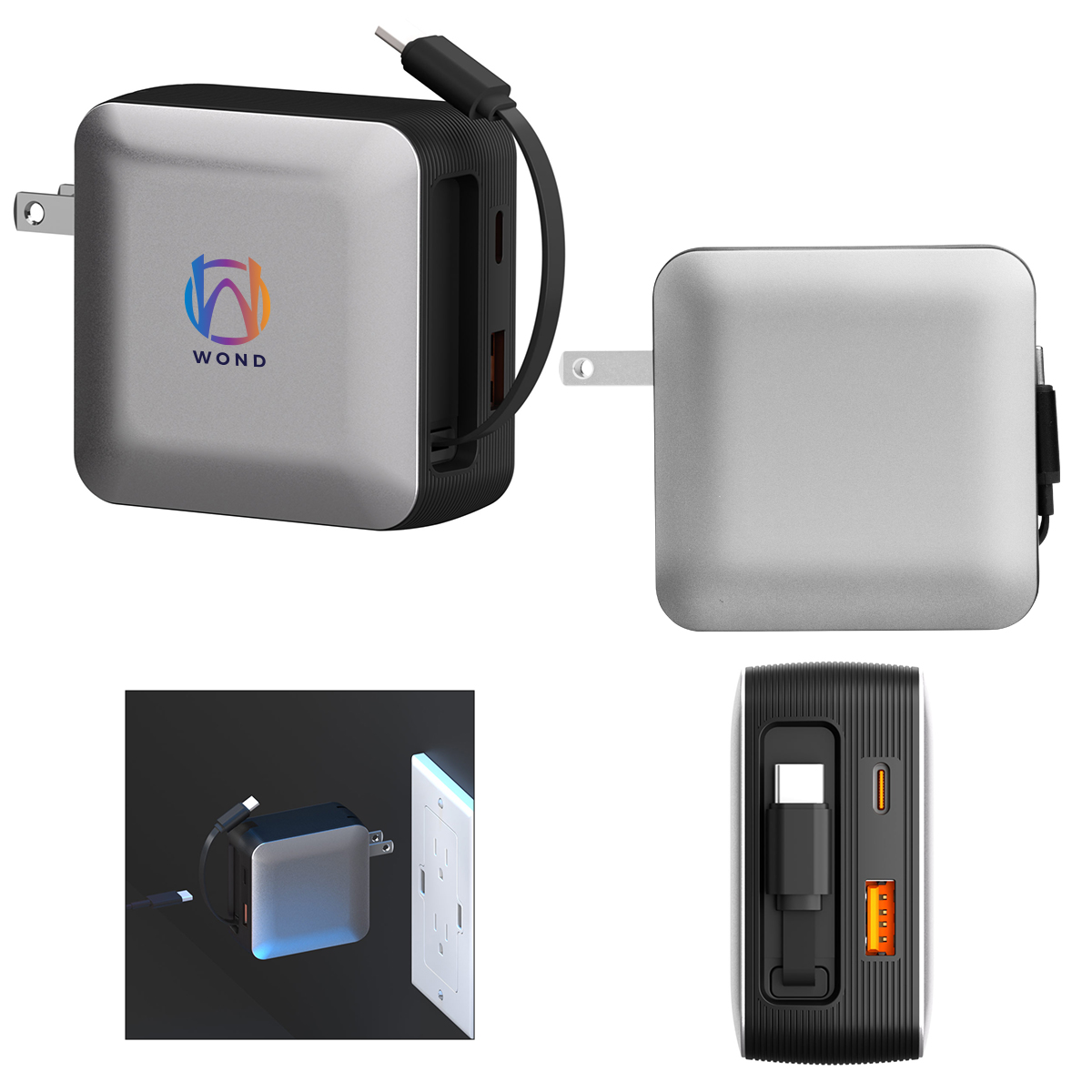 Made Of Polycarbonate Composite. Minimal, Ultra-Small And Portable. Foldable AC Wall Prongs And High-Speed Charging Capabilities. Features 1 USB-A & 2 USB-C Outputs. 1.25" D x 2.5" W x 2.5" H
