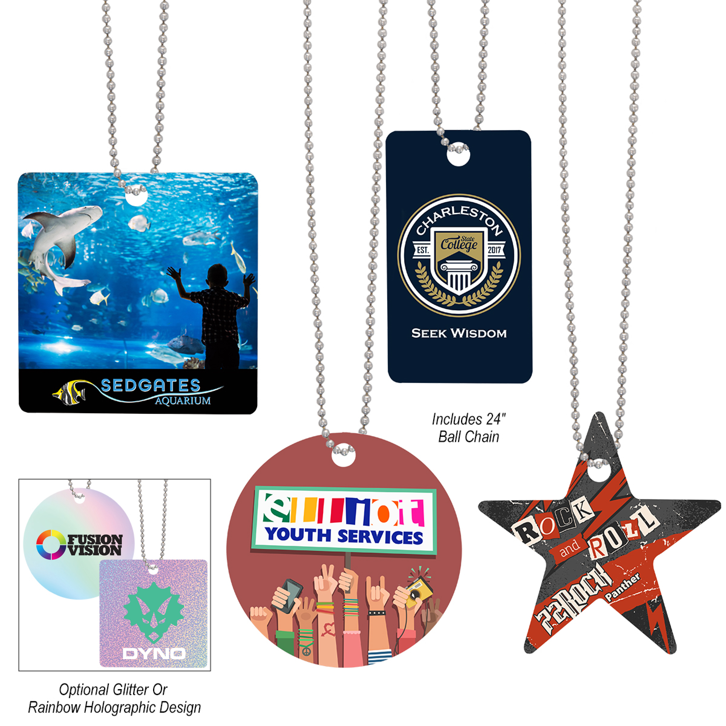 Create Your Own Acrylic Charm Shape. Features Full Color Edge-To-Edge Graphics. Includes 24" Ball Chain. 2" W x 2" H