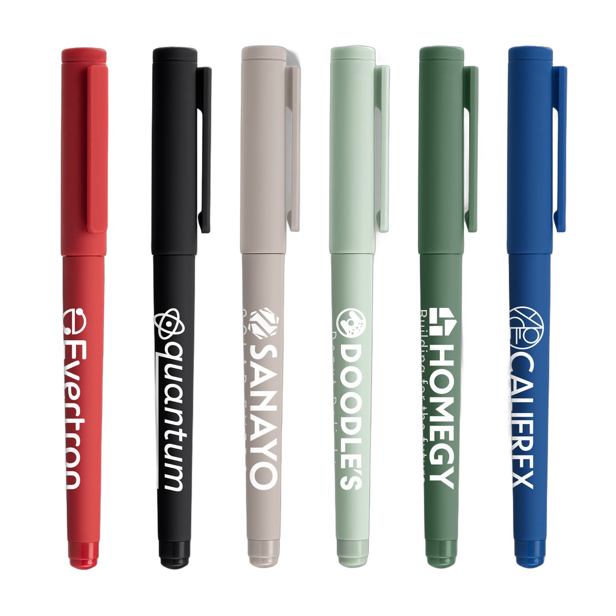 The Aeris Recycled Plastic Monochrome Gel Pen combines everyday functionality with clean, modern design. Made from durable rABS plastic, it features a satin rubber-feel barrel for a soft, comfortable grip and a streamlined, monochrome look. The injection-molded cap snaps securely in place and fits neatly on the end when in use. A slim 0.7 mm gel refill delivers smooth, consistent lines for up to 400 metres. Available in nature-inspired tones—Red, Forest, Sage, Navy, Stone, and Black—Aeris offers reliable performance with a conscious, minimal aesthetic. 5.71" W x 0.47" D