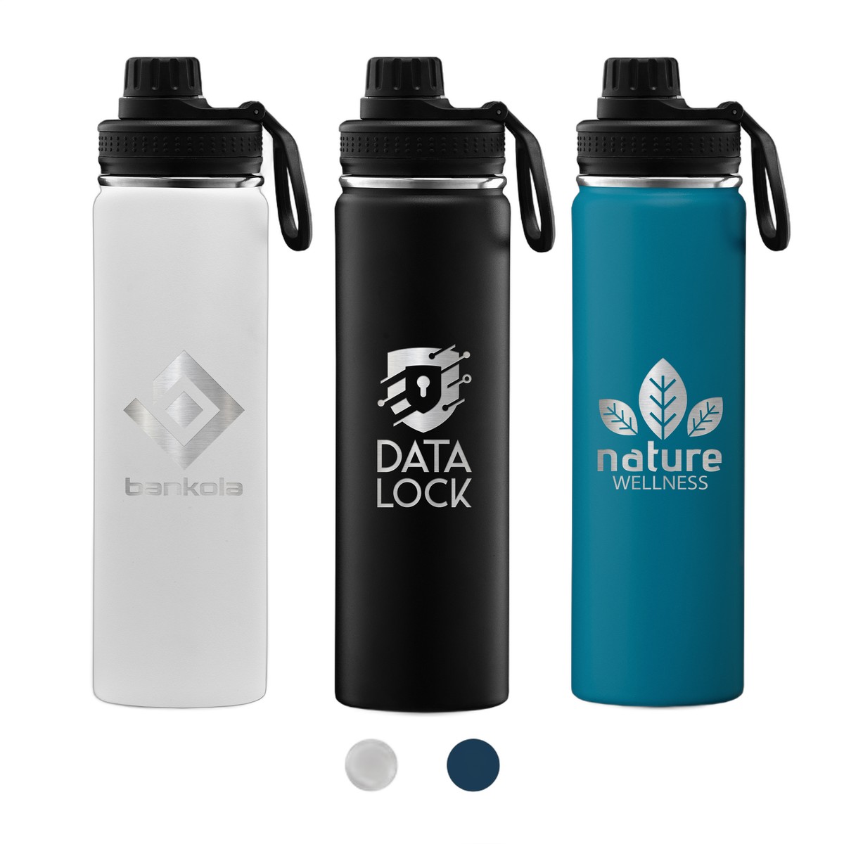 Our Alaska 24 oz Stainless Steel Double Wall Water Bottle has a powder coating that is chip repellent and durable. Enjoy a Stainless Steel, Double wall vacuum water bottle with screw-on, leakproof lid, and carry handle. This generously sized water bottle can keep drinks cold for up to 6 hours. The Alaska bottle is a great way to help people keep hydrated, while showing off your company logo all day, every day. . Complies with Prop 65. 10.83" H x 2.91" W