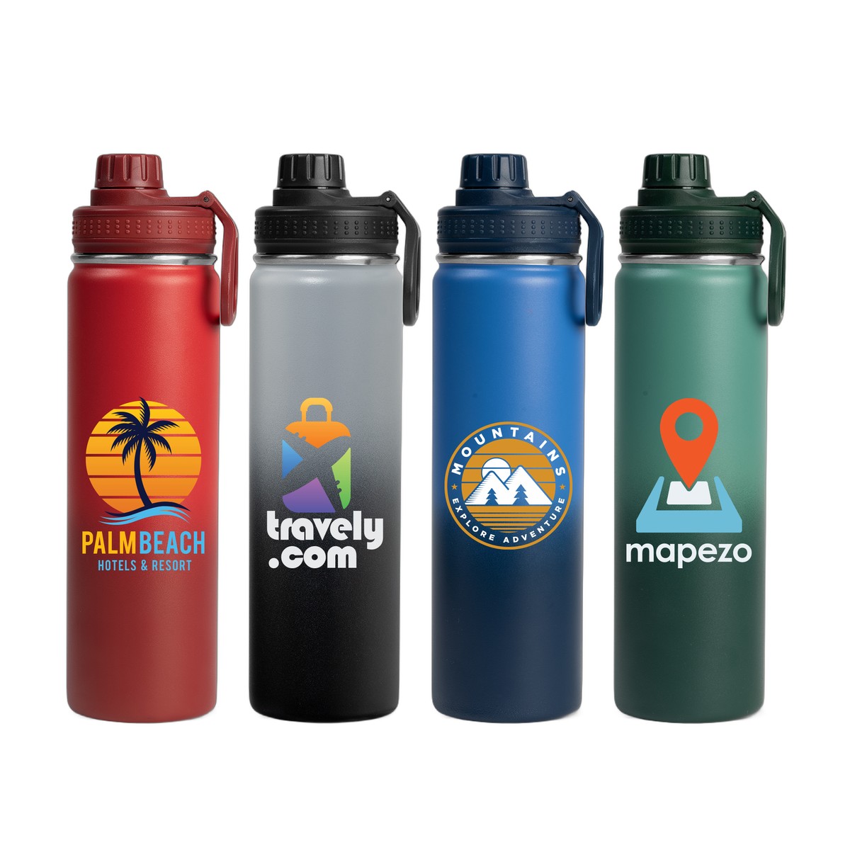 Our Alaska Ombre 24 oz Stainless Steel Double Wall Water Bottle has a beautiful ombre color gradient powder coating that is chip repellent and durable. Enjoy a Stainless Steel, Double wall vacuum water bottle with screw-on, leakproof lid, and carry handle. This generously sized water bottle can keep drinks cold for up to 6 hours. The Alaska bottle is a great way to help people keep hydrated, while showing off your company logo all day, every day. . Complies with Prop 65. 9.53" H x 2.91" W