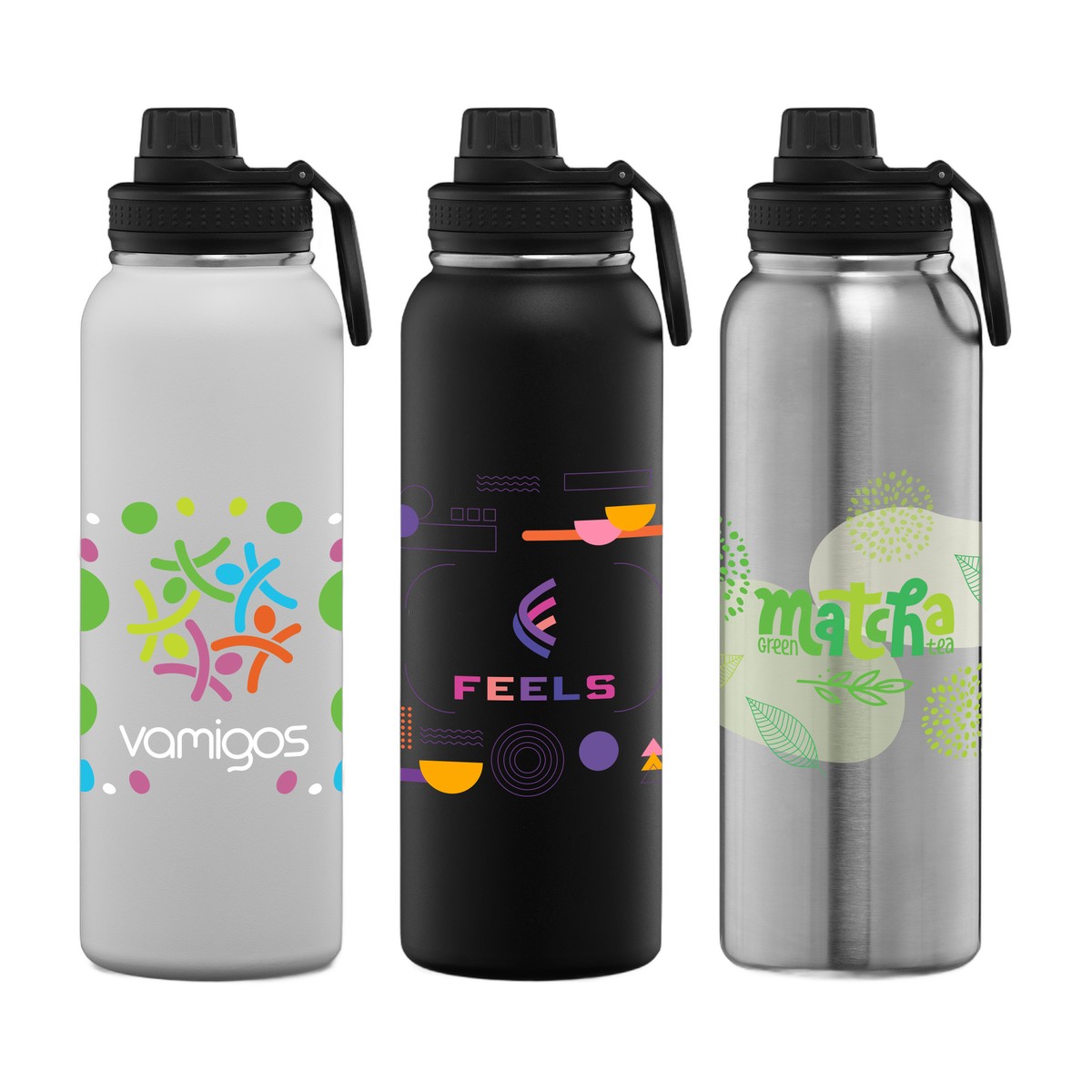 Check out our Stainless Steel, Double wall vacuum water bottle with screw-on, leakproof lid, and carry handle. Our Alaska Ultra 40-ounce Stainless Steel Double Wall Water Bottle has a powder coating that is chip repellent and durable. This extra-large double-wall water bottle can keep drinks cold for up to 6 hours. The Alaska Ultra bottle is an amazing way to help people keep hydrated, while showing off your company logo all day, every day. . Complies with Prop 65. 11.61" H x 3.54" W