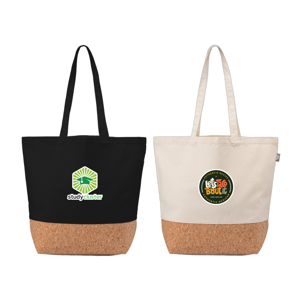 Introducing our Alentejo Recycled Cotton Tote Bag w/Cork Bottom – a chic choice for everyday use. This tote is crafted from recycled cotton (55% cotton + 45% polyester) and cork for a unique touch. Featuring features a solid color on both the bag and handles, the long handles, measuring 24.02" x 0.79", ensure comfortable carrying. With a bag size of 16.93" × 14.17" × 6.3" and a cork part height of 3.94" it offers a spacious 15 L capacity and supporting a maximum weight of 11 lbs. Additionally, the eco tag, made of Jacquard material, is sewn on the outside, on the upper right side of the bag, featuring a leaf design on one side and proudly stating "recycled cotton" on the other. Your logo will be imprinted using our Full Color Heat Transfer technology. Complies with Prop 65. 14.17" H x 16.93" W x 6.30" D
