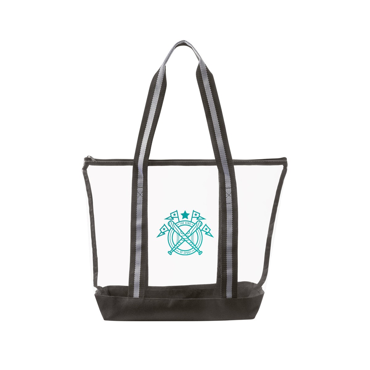 TPU clear tote bag with 600D Polyester base and striped Polyester Web handles. The transparent design makes locating your items simple and seamless. The pliable material bends and expands with your stuff, unlike stiff, crunchy PVC, giving you extra room without the bulk. Zippered closure allows you to keep everything safely tucked inside. Straps measure approx. 46"l x 1.3"w (end to end). Recommended weight tolerance: 17.5 lbs. 13.2000" W x 14.0000" H x 4.5000" D