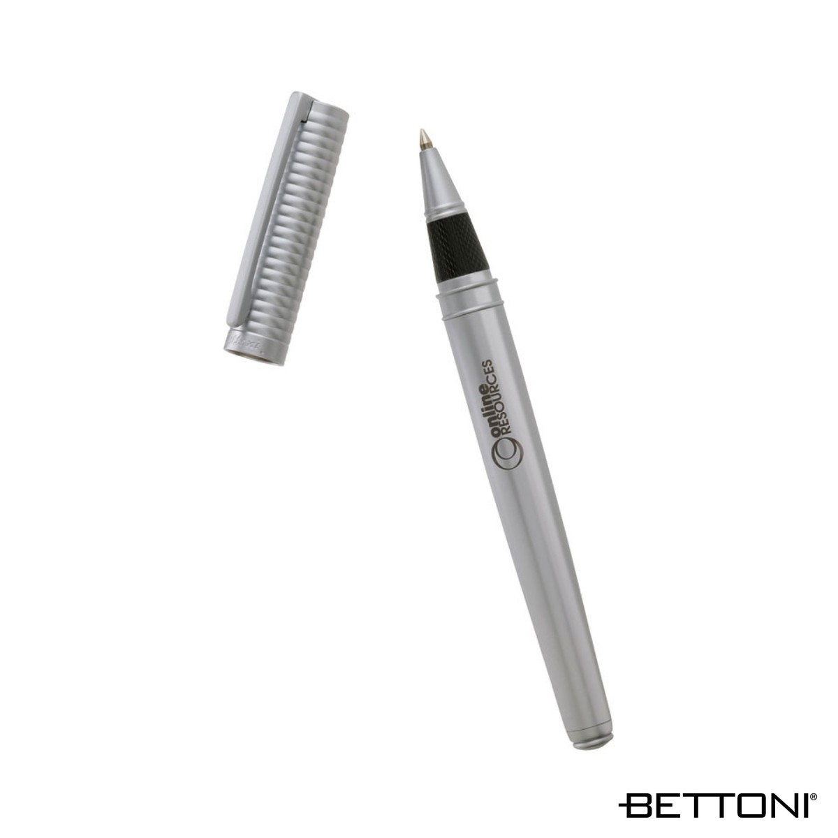 Cap-off rollerball with ribbed cap design and matte silver finish. Complies with Prop 65. 9/16" W x 5 1/8" H x 3/8" D