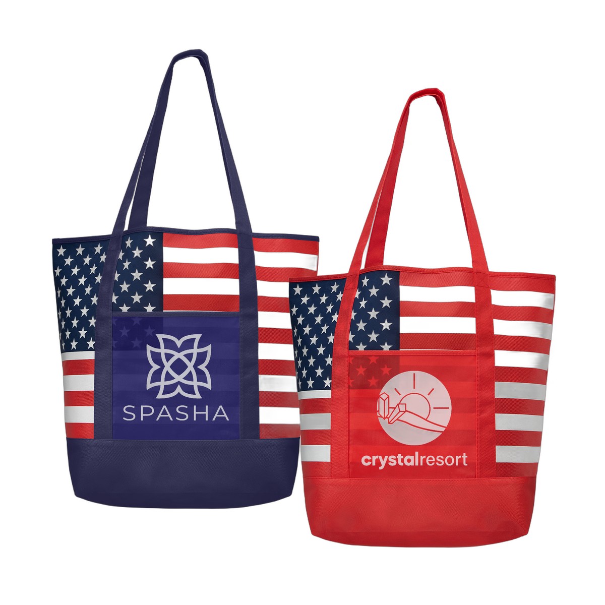 Carry your American spirit everywhere you go, with our American Flag Non-Woven Tote Bag with 210D polyester pocket. This colorful tote bag features a printed American Flag pattern combined with blue or red trim. It has a wide 7" gusset, allowing for ample room for groceries and other items. Customize the front panel with a white silkscreen imprint. CA Prop 65 Compliant. Measuring 18.9" wide x 15.16" high. Everyone is ready for fun with this promotional tote. The two-tone non-woven tote bag features a patriotic design that draws attention to your logo on the front. Reinforced handles and an outside pocket make this the perfect bag for those on the go. Your recipients will use it for travel, shopping, school, and sports. The Morris Tote with Patriotic Design is a great giveaway for special events and retail stores. Long Description Check out a few more features that make the Morris Tote with Patriotic Design an ideal giveaway for the most festive occasions: Gusseted bottom for greater ca. Complies with Prop 65. 15.16" H x 18.90" W x 7.09" D