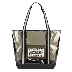 The Anaheim Clear Tote combines style and convenience. It features a clear body with a black bottom and 4.5" gusset, a zippered main compartment, and a front pocket for easy access to small items. With 22.5" two-color webbing carry handles, this tote ensures easy entry at sporting events, conferences, concerts, and festivals, complying with clear bag safety protocols. Its wipeable surface makes cleaning a breeze, and being PVC-free, it offers a practical solution for organizations and in. 18" W x 14" H x 4.5" D