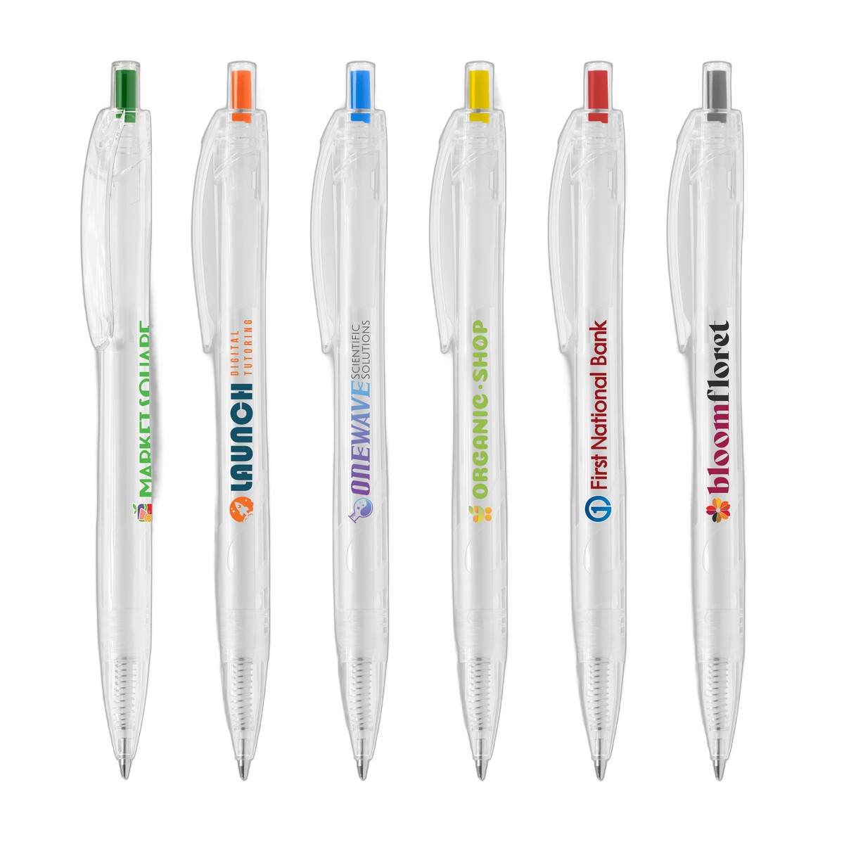 Our stylish Aqua Clear pen features clear outer components made with 100% recycled P.E.T. plastic. The long-lasting jumbo refill on this ballpoint pen will help make this pen a favorite eco-conscious promotional product. Colorful accents in the plunger complete the look, and will complement your 1-color silkscreen imprint. Complies with Prop 65. 5.62" W x 0.59" D
