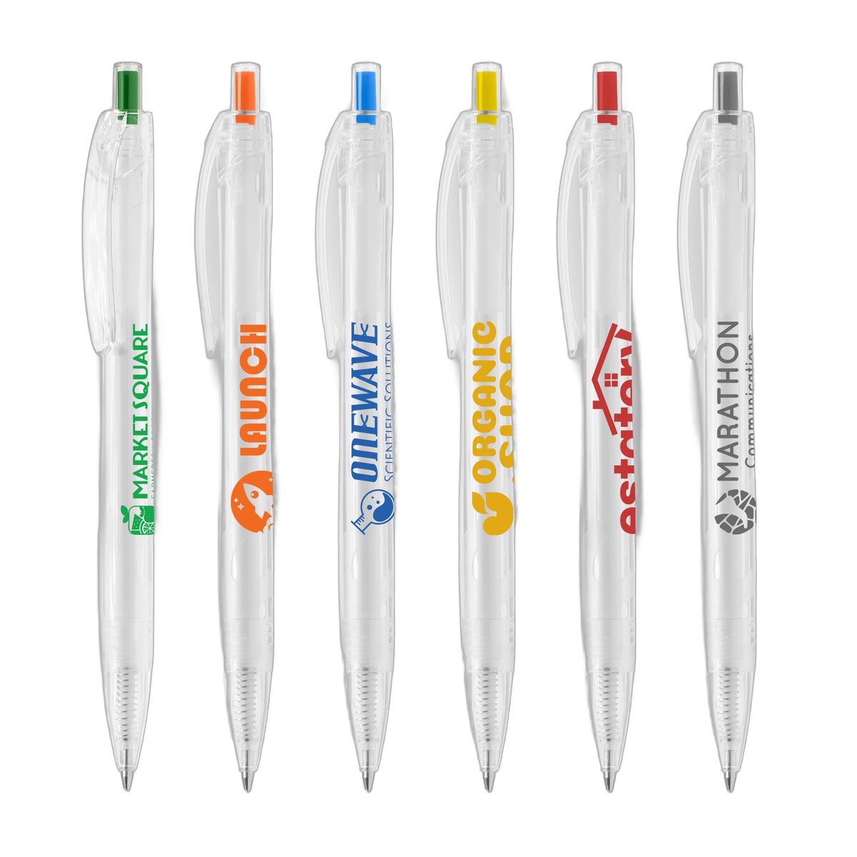 Our stylish Aqua Clear pen features clear outer components made with 100% recycled P.E.T. plastic. The long-lasting jumbo refill on this ballpoint pen will help make this pen a favorite eco-conscious promotional product. Colorful accents in the plunger complete the look, and will complement your 1-color silkscreen imprint. Complies with Prop 65. 5.62" W x 0.59" D