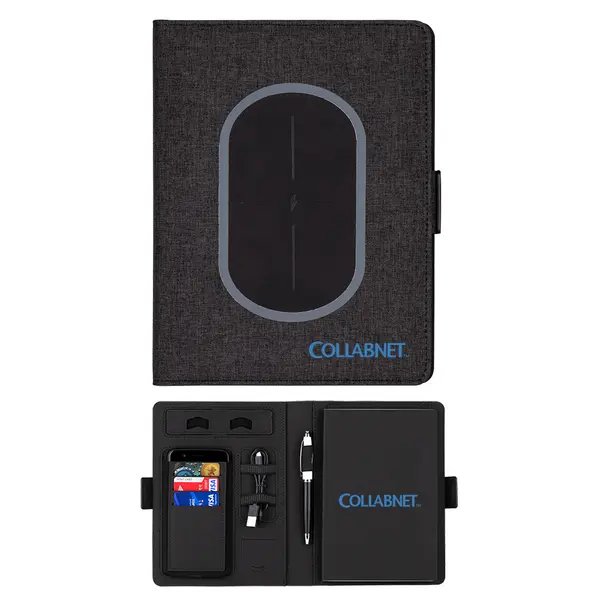 Linen polyester/soft PU wireless charging portfolio with magnetic closure. Integrated 5000mAh built in power bank for powering the wireless charging pad. Internal pop up USB port for non-wireless charging. Includes replaceable 64 ivory sheet lined notebook with matte black cover (8-1/4"L x 5-1/2"W x 3/8"D); organization panel (card holder, phone/tablet stand, elastic storage); pen loop; interior LED indicator. Output: 5V, 5W, 1A; USB to micro USB included. Packaged in black P2P gift box. Complies with UL. 8.875" H x 6.75" W