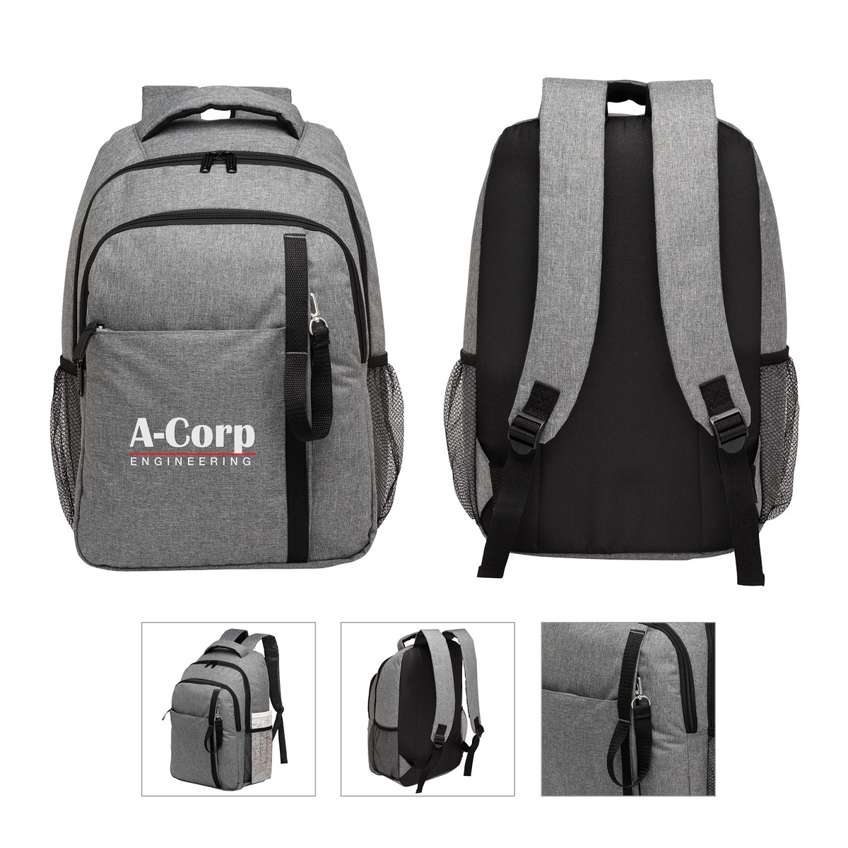 The Asheville Computer Backpack has a stylish and modern design featuring a two-tone grey material finish. Its constructed from durable 300D polyester and features a large zippered main compartment with a laptop sleeve that fits most laptops up to 15.6". It has 3 exterior zippered pockets, one with a vertical zip and swivel hook chain, and 2 side mesh pockets for storing your accessories or a water bottle. Carry the Asheville in comfort using its soft padded top handle or adjustable padded backpack straps. Complies with Prop 65. 11" W x 17 1/4" H x 5 1/4" D